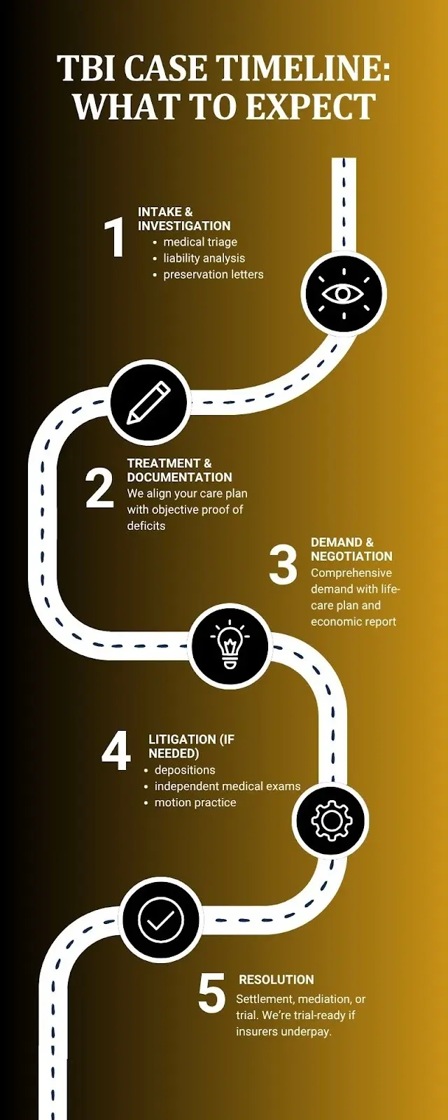 The TBI case process typically follows five phases, from initial investigation through resolution. Each step builds evidence to maximize your compensation and ensure your long-term needs are covered.
